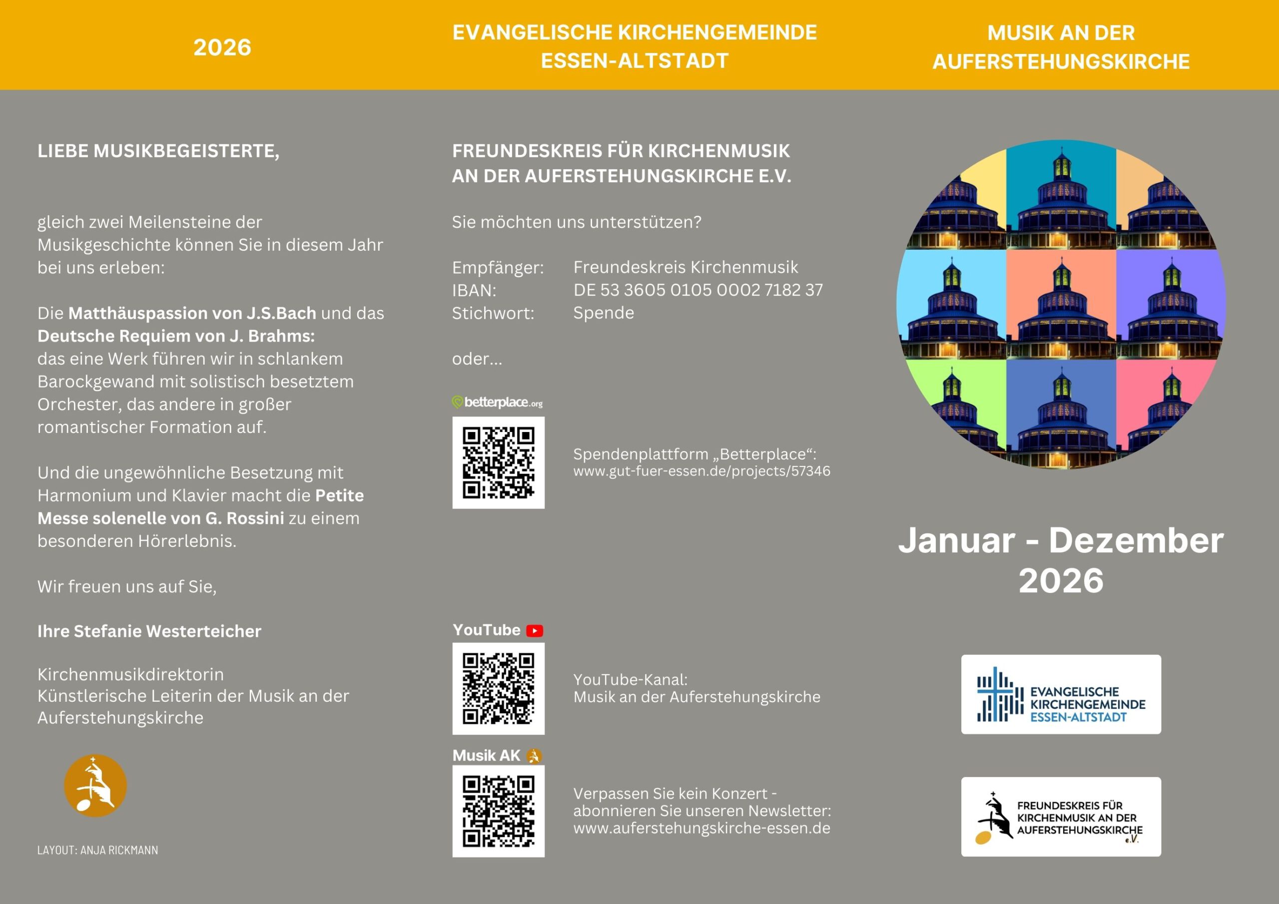 An der Auferstehungskirche findet ein reichhaltiges, qualitativ hochwertiges musikalisches Leben statt, welches die Kultur der Stadt Essen prägt.
